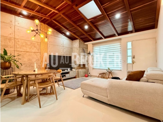 Área 124 mts, 1 piso, sala comedor con chimenea a gas, altillo, cocina abierta, zona de ropas, patio trasero con techo corredizo, 3 cuartos 2 baños, 2 parqueaderos.